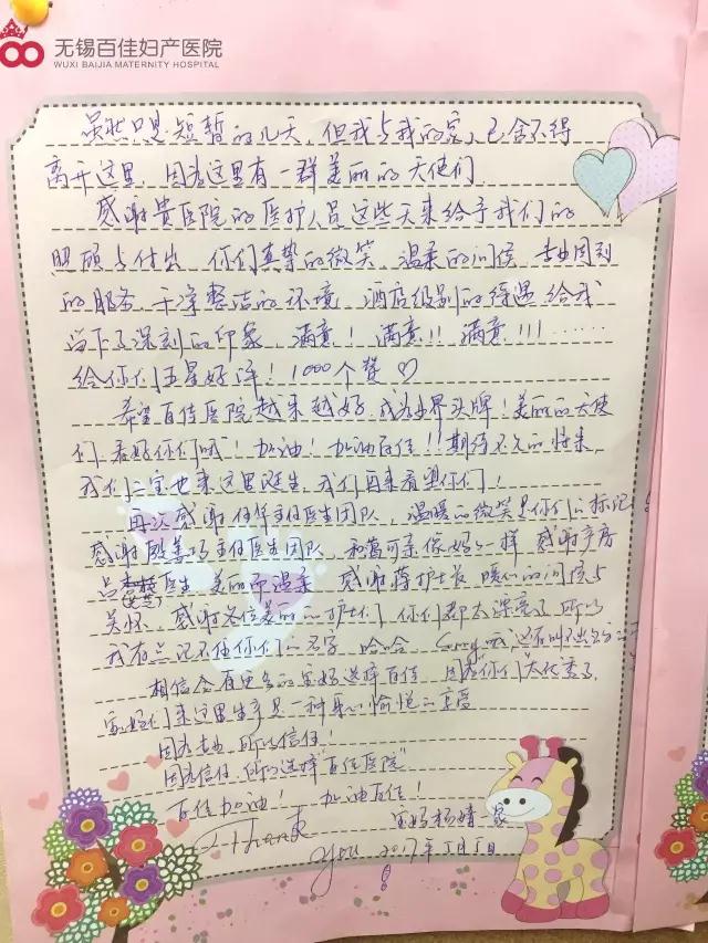 自从怀孕以来,热情周到的服务让我感觉回到了家一样,感谢虞娴姐姐的细心引导,感谢谢主任的细致检测,感谢负责产检的医护人员。感谢百佳,有爱有家,有百佳。